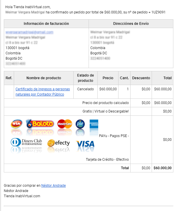 Hoy les comparto una de las ventas virtuales que llegaron a mi tienda desde el siguiente enlace: