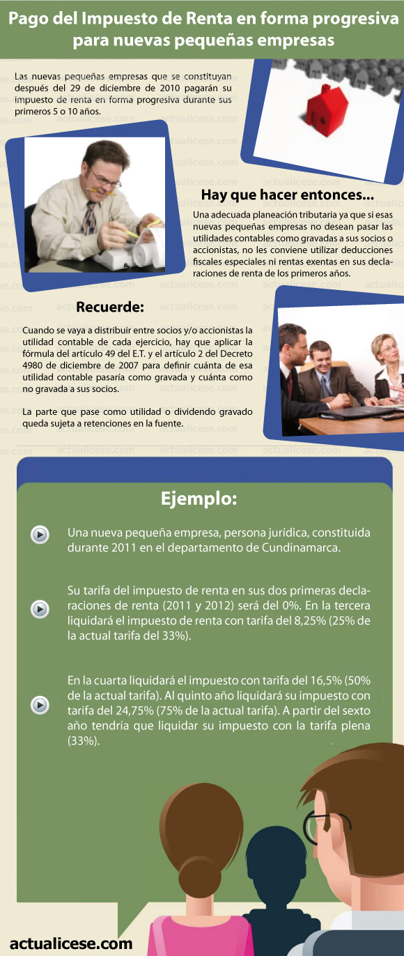 Hay que tener presente que las nuevas pequeñas empresas que se constituyan después del 29 de diciembre de 2010 pagarán su impuesto de renta en forma progresiva durante sus primeros 5 o 10 años, lo que tiene un efecto en el cálculo de las utilidades contables gravadas y no gravadas.